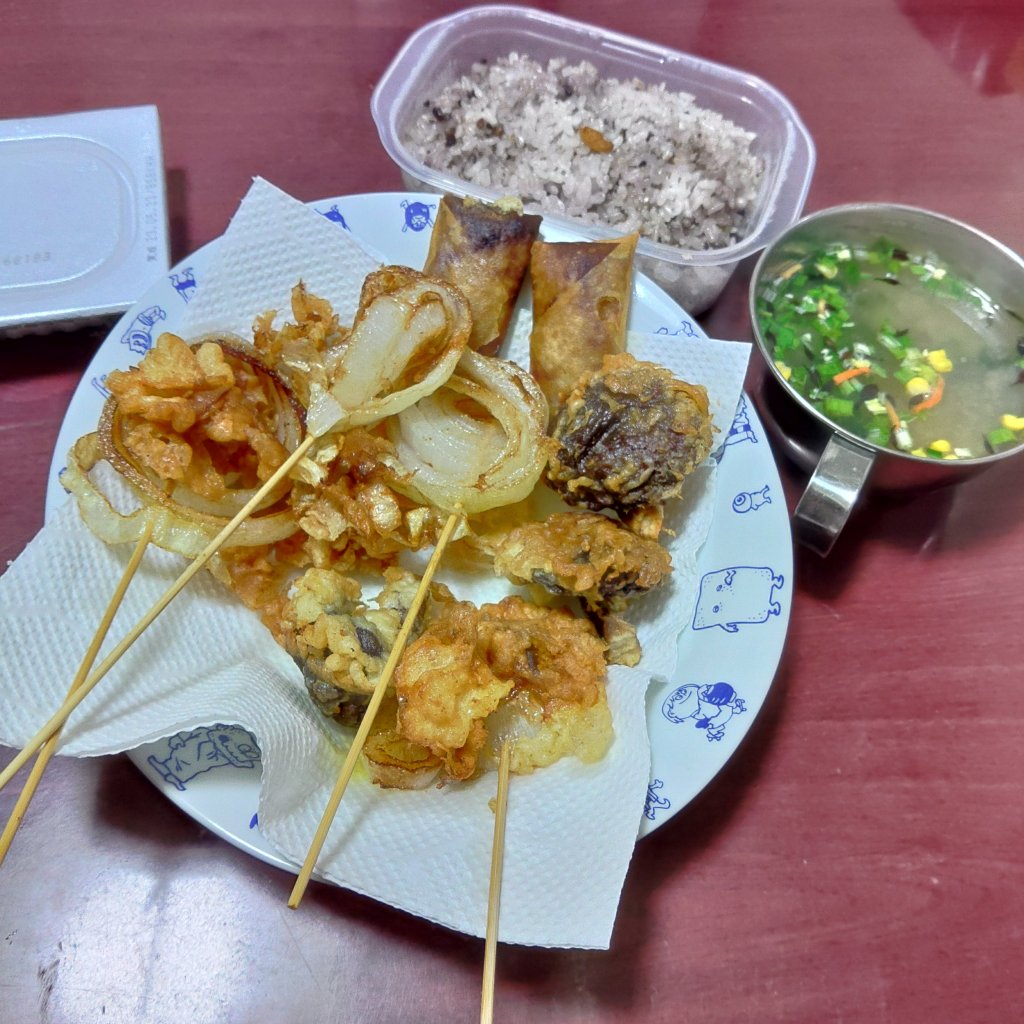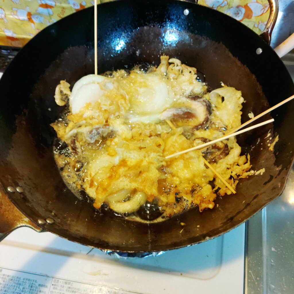 最近のハマってる具材は玉ねぎです。天ぷらにすると甘くなります。いつもバラバラになるので今夜は串に刺して揚げてみました。