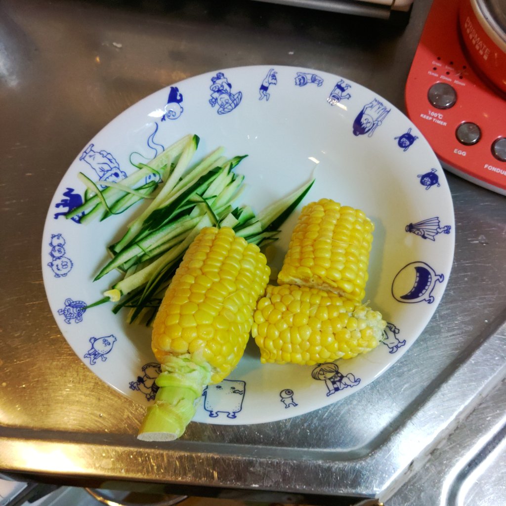 盛り付けは変わらず下手です。野菜はキュウリとブロッコリーとコーンでした。タンパク質にソーセージと生玉子を入れてみました。
