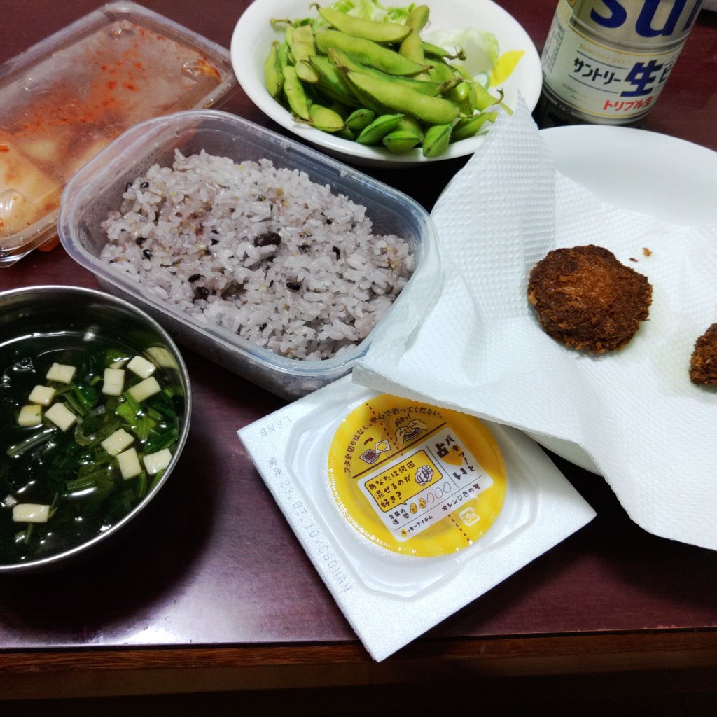 ヒレカツ、納豆、枝豆、キムチ、味噌汁、御飯(^_^;)暑かったのでビールうまっ!!