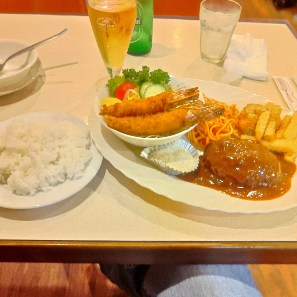 注文したのは洋食王道のデミハンバーグ&エビフライ。ハンバーグがフワフワで驚きました。